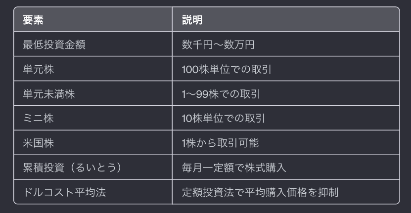 主要な投資方法として、単元株や単元未満株、ミニ株があり、特に単元未満株では1株からの投資が可能で、低リスクで始められます。